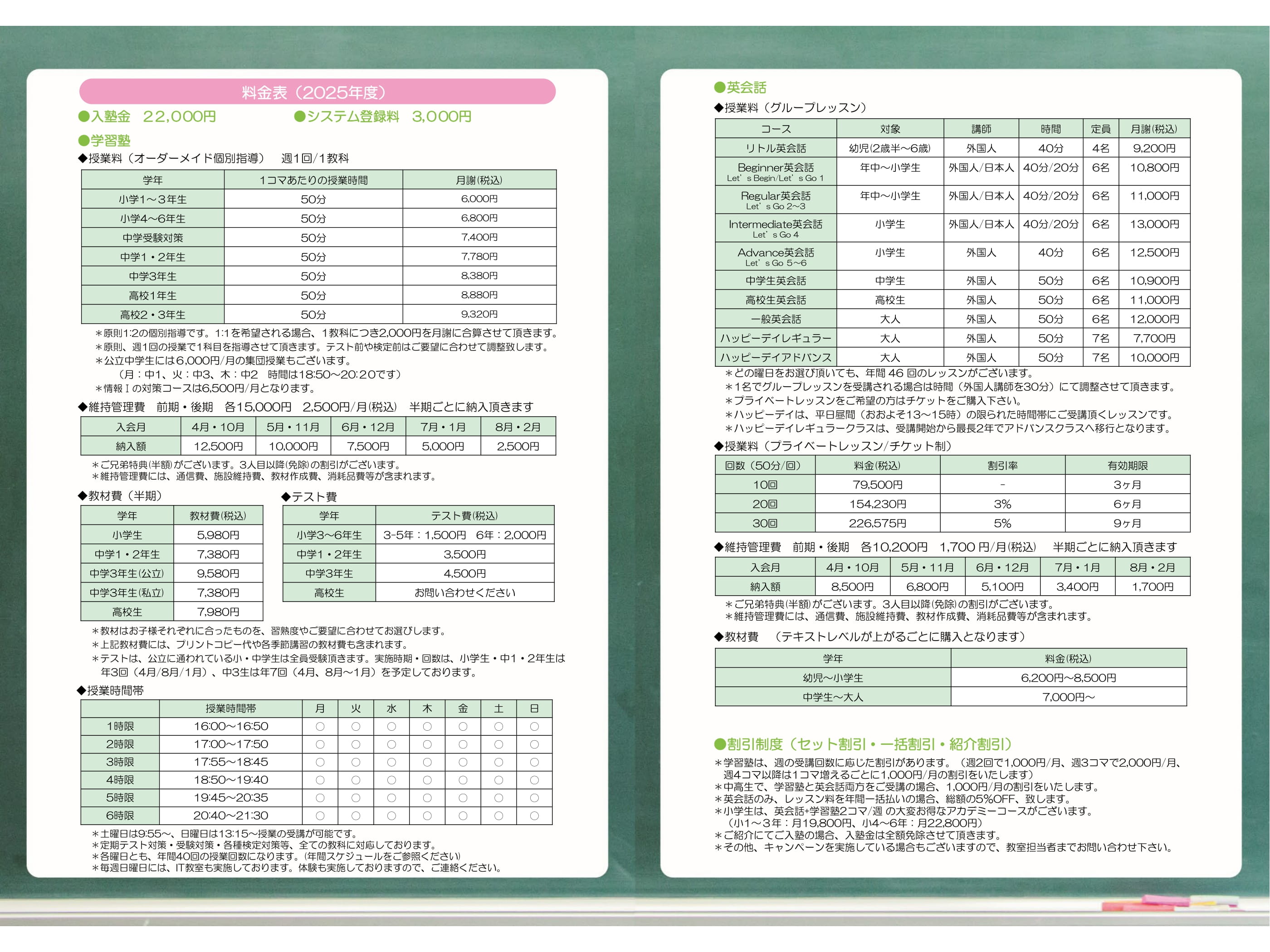 まず、英会話教室として、英語検定や、TOEICなどの資格試験。外国人講師と日本人講師のチームティーチングにより実現した実用的な英語学習など、英語が苦手な子から得意な子まで、幅広く対応できるカリキュラムをご用意しております。